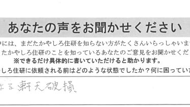 お客さまの声 【中野市】軒天張替え ~雪による影響で軒天が壊れた~工事の総合評価星4.5アンケート写真お客様の声たかやしろ住研たかやしろ住研に依頼される前はどのような状態でしたか?何に困っていましたか?男性のお客様雪による軒天破損。たか... 2022.07.29 2025.09.24 お客さまの声中野市地域屋根