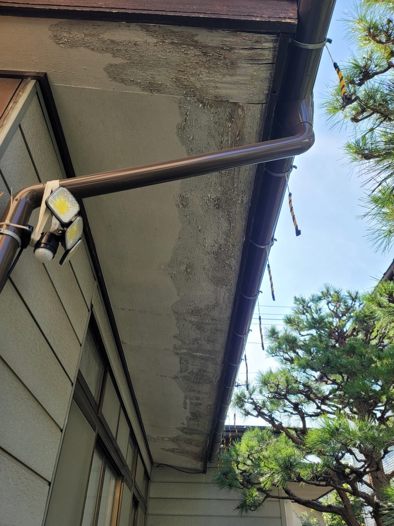 この部分は特に劣化が酷く、白ベニヤも穴があいています。また、鼻隠し(雨樋を取付ける板)も手で押すと凹むくらいフカフカしている状態。