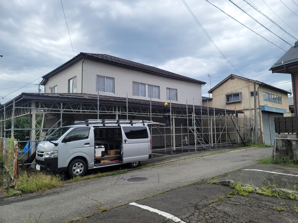高さも脚立足場では微妙な高さで距離も長かったので安全のために仮設足場で行なうことにしました。
