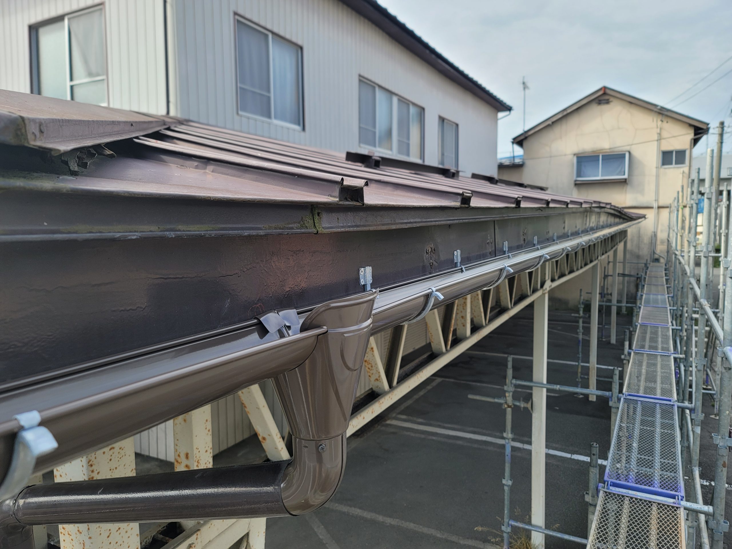 東面は雨樋が垂れて雨水が溜まり、堆積物も見られました。また、2階からの配樋が無く、1階の雨樋に雨水が流れ込みにくい状態でした。北面は駐車場の出入口で最重要箇所ですが、屋根が波打っており、穴が開いている箇所があったり、全体的に水勾配が適切に取れていませんでした。