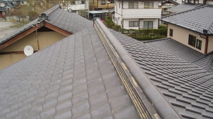 工事前写真 工事前01:棟瓦 棟に積もった雪や棟の北側に積もった雪に引っ張られた…