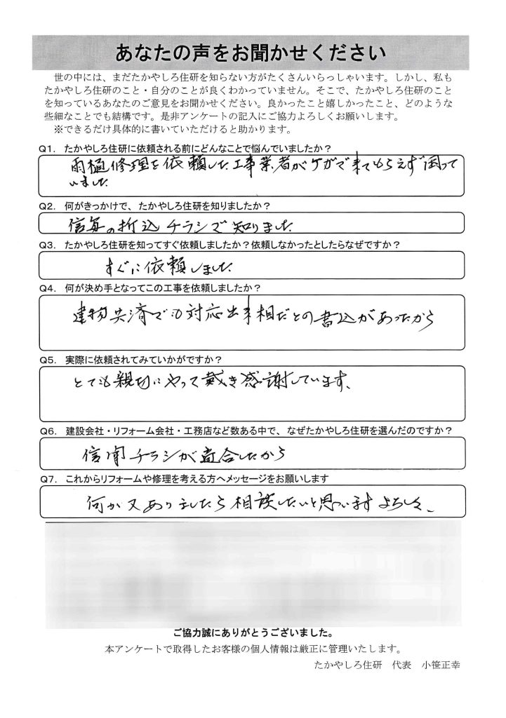 建設会社・リフォーム会社・工務店など数ある中で、 なぜたかやしろ住研を選んだのですか?