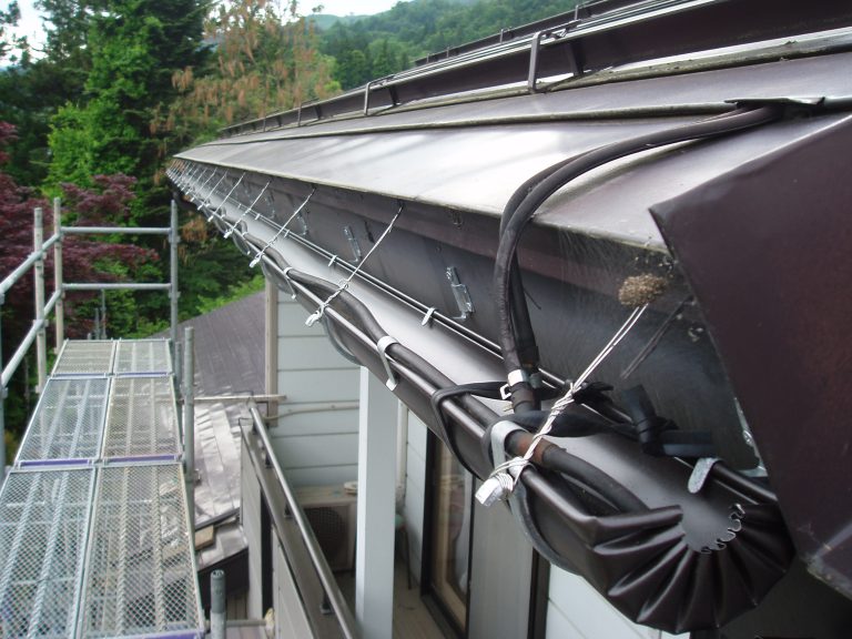 たかやしろ住研で雨樋を取替えた後、藍葉様の普段お願いしている電気屋さんに雨樋で凍らせないためにヒーターを設置。