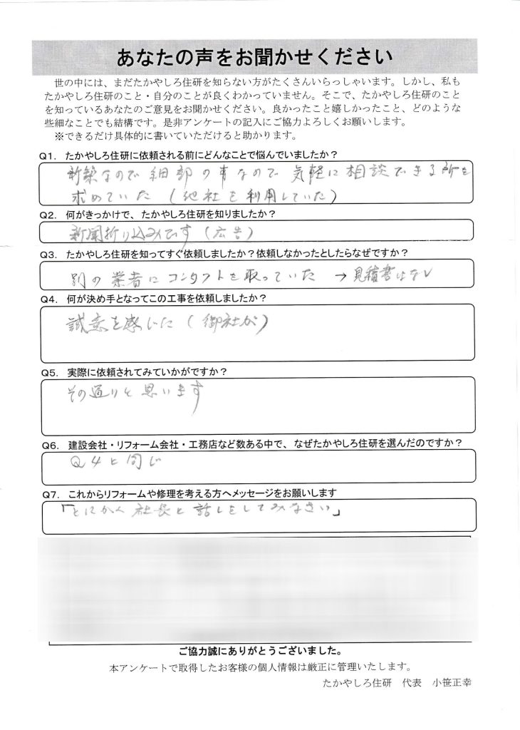建設会社・リフォーム会社・工務店など数ある中で、 なぜたかやしろ住研を選んだのですか?