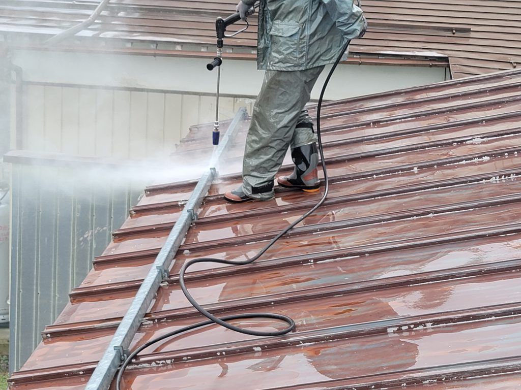 屋根に上って状態を確認したら屋根下地はそんなに悪くはなかったので、お客様の予算もあるので4工程3回塗りではなく、3工程2回塗り(高圧洗浄・下塗り・上塗り)にすることを提案した。