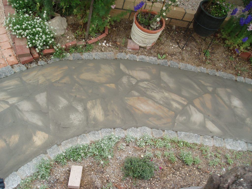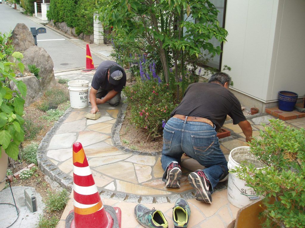 アプローチに一通り石を敷き詰めたら、モルタルを流します。