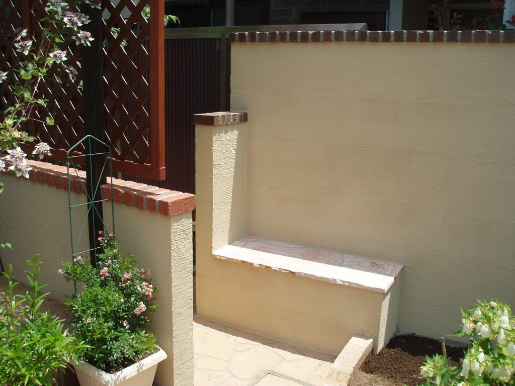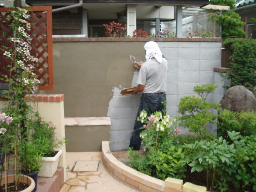 ブロックを積み終わり、笠木も取りつけてから下塗りを左官屋さんがしています。