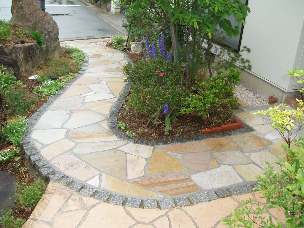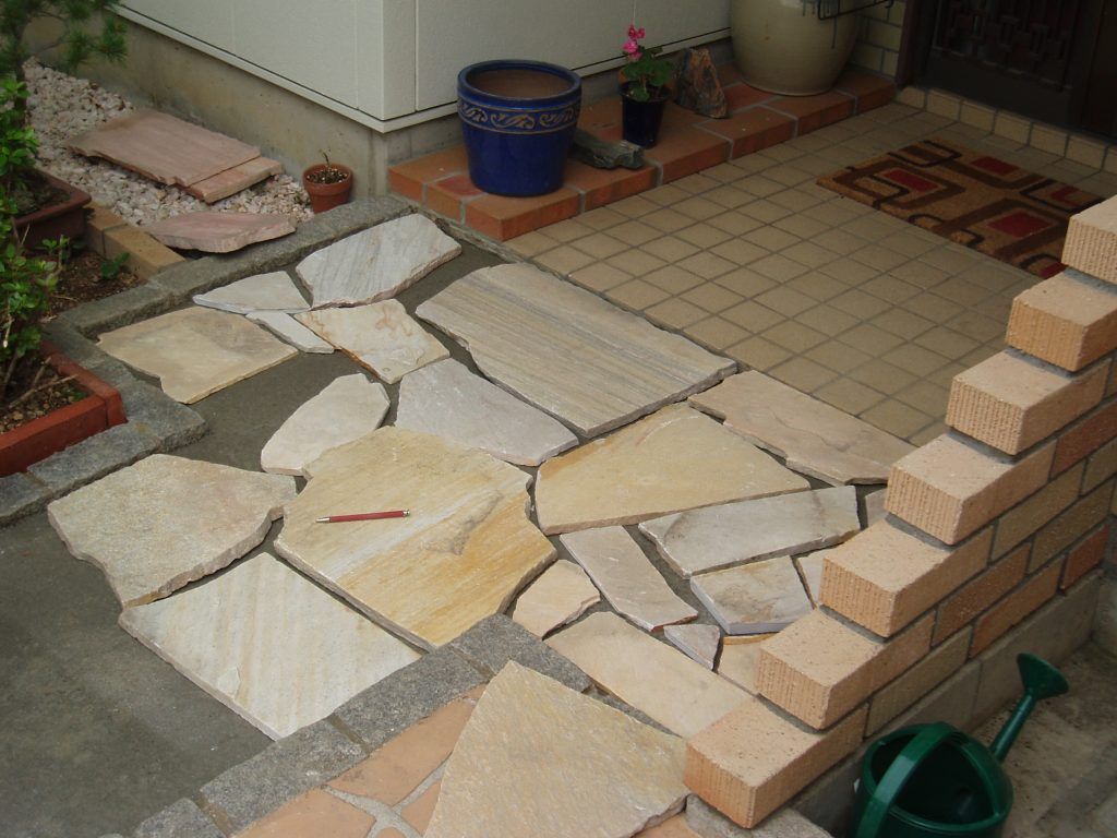 アプローチの端は取替えず中に自然石(パラストーン)を貼りました。