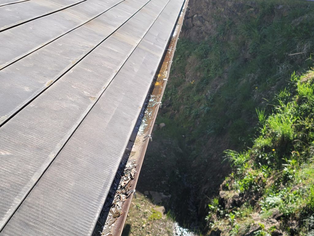 雪の影響で雨樋が垂れ、雨水が溜まっている。お客様が言っているように葉っぱもたくさんある。