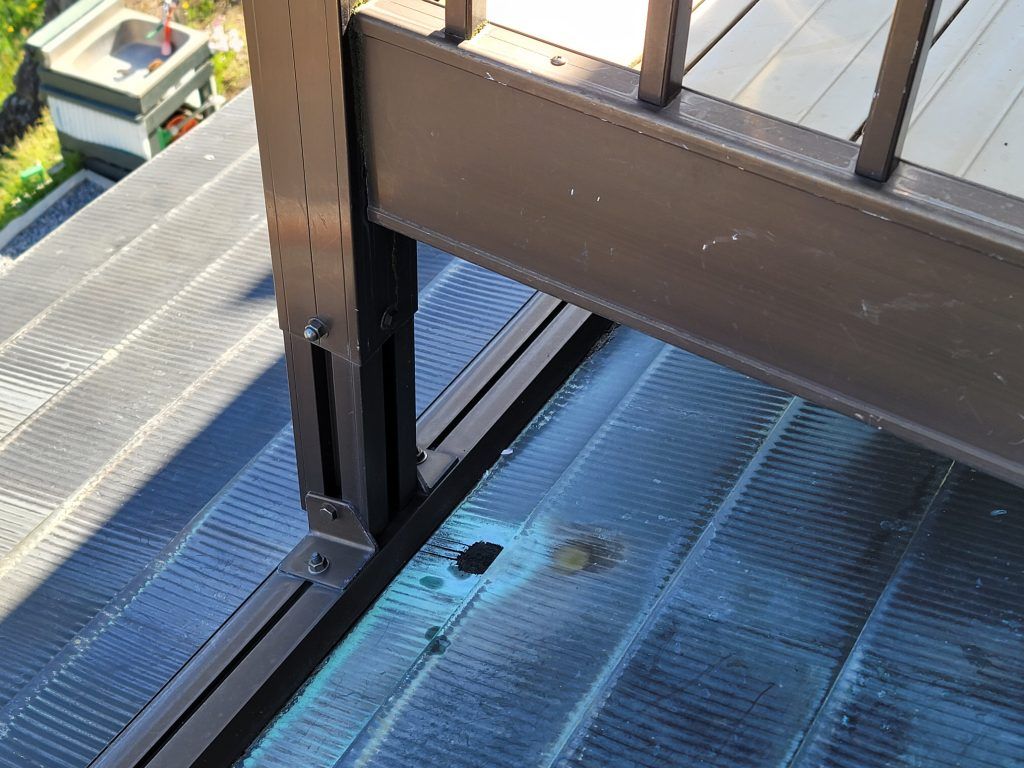 ベランダの脚の部分の銅板葺きの屋根に穴が開いている。反対の脚の部分も同じ状態。