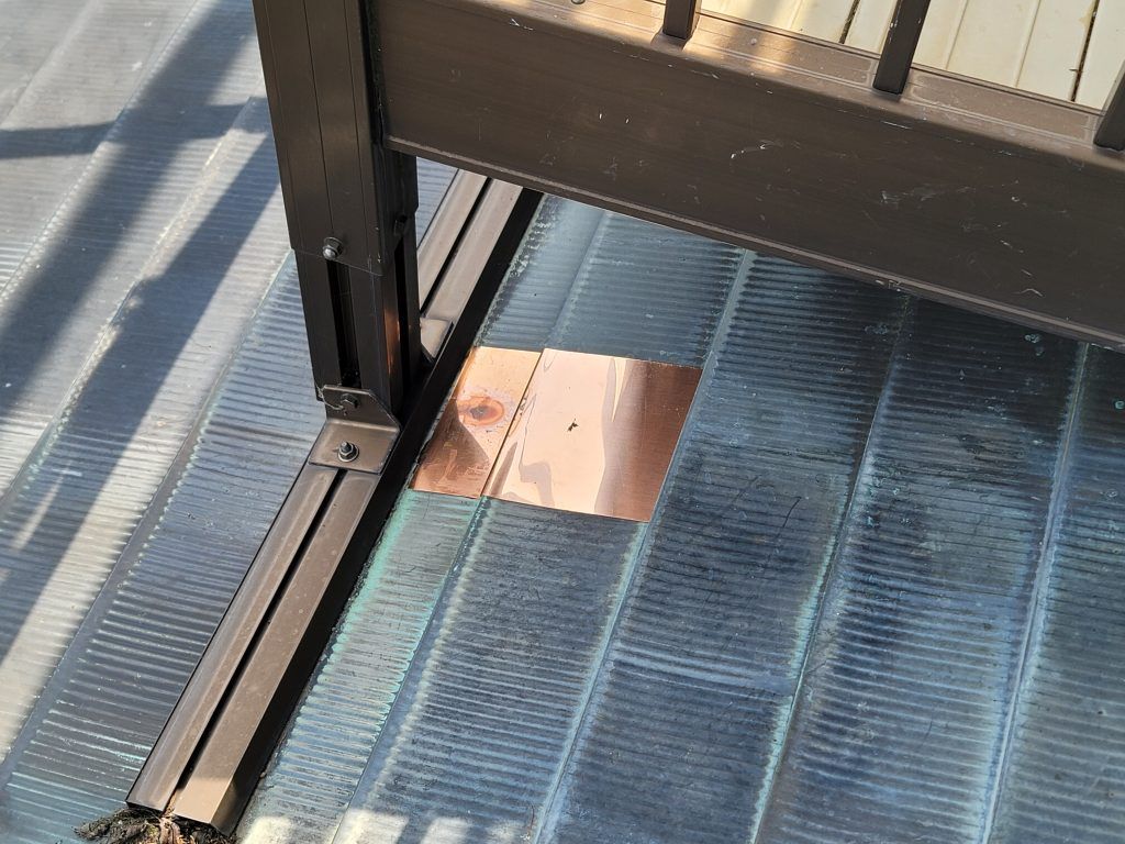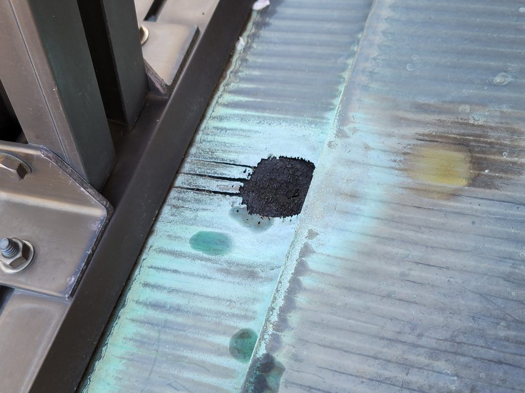 本来であれば、ベランダ撤去して当該部分を葺き替えなんですが、費用がかかりすぎるため、お客様の打合せをして同じ銅板でパッチングで済ませました。