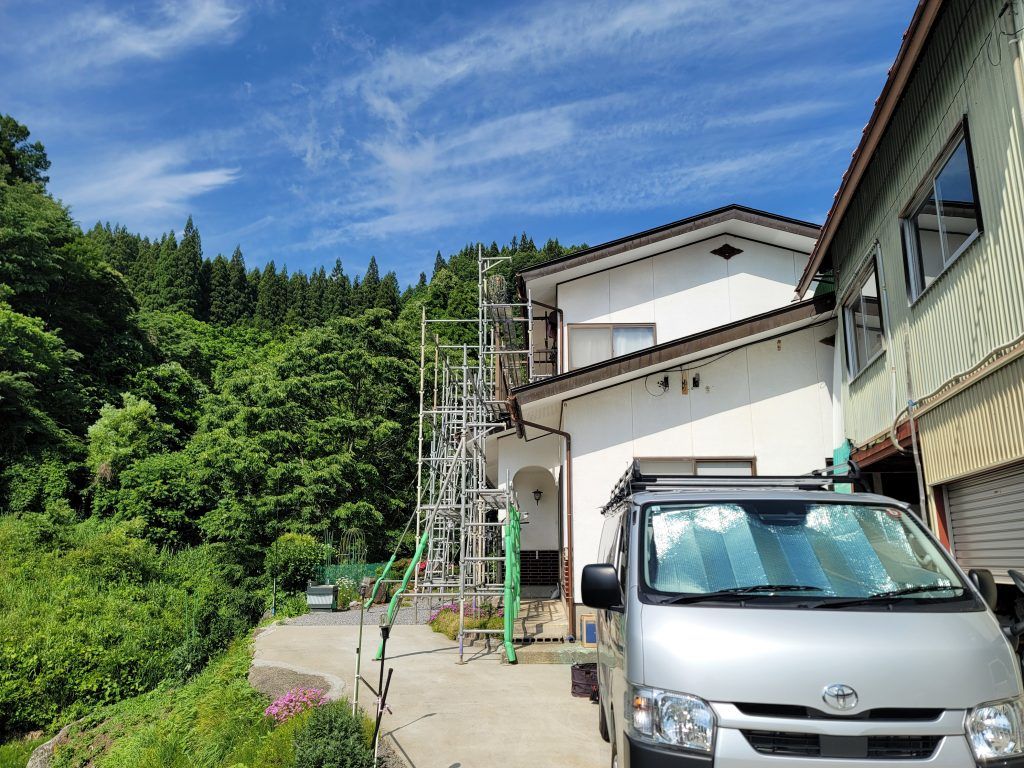 前日に足場屋さんに組み立ててもらい今日から板金屋さんの取替え工事がスタートです。