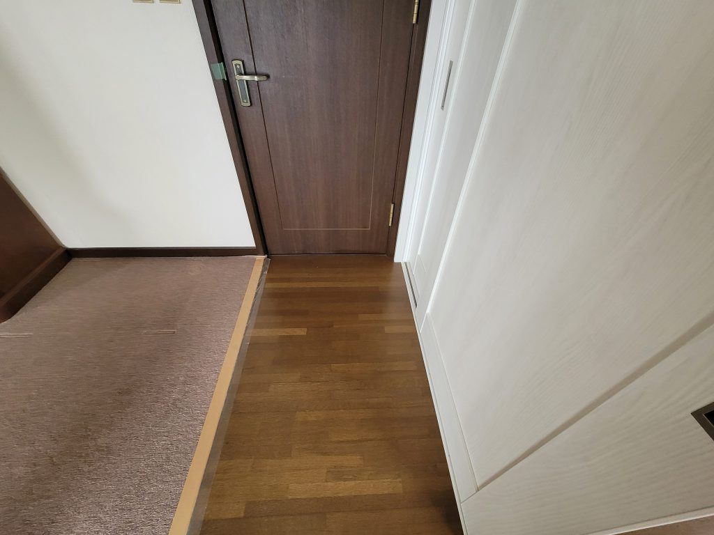 この状態でドアを開けると可動間仕切にドアノブが当たり、傷付けてしまうので戸当たりを床に設置。
