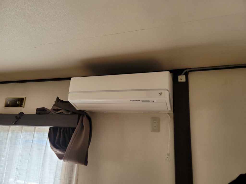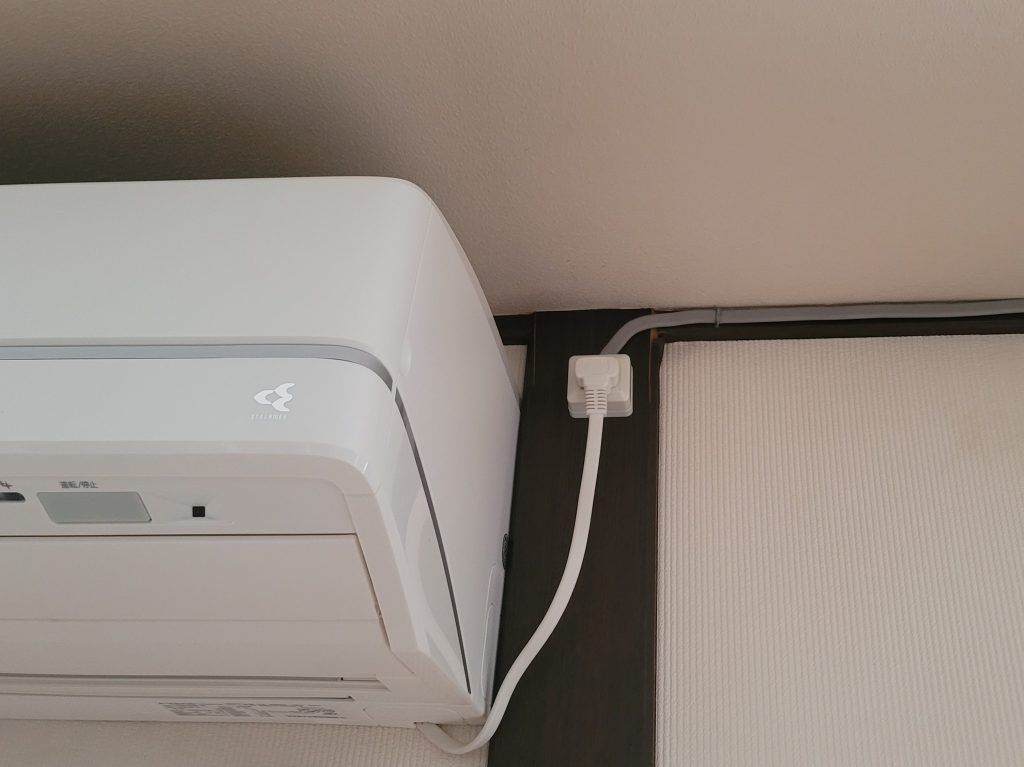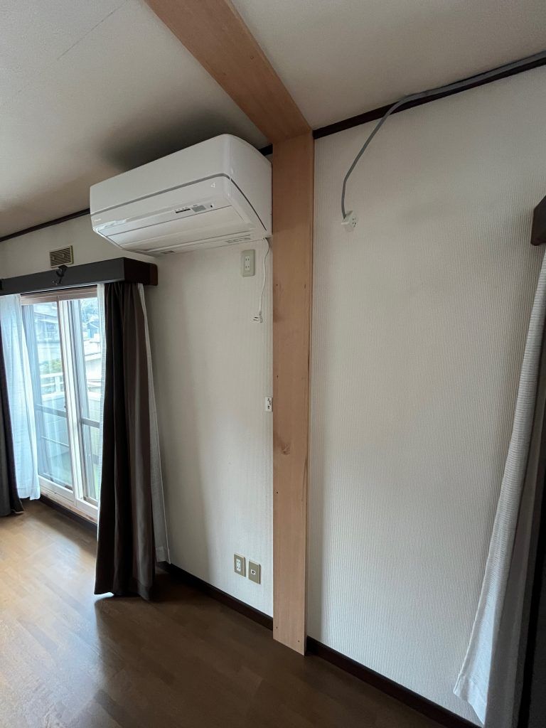 ダークブラウンの付け柱に間仕切を設置するんですが、エアコンの200Vコンセントが邪魔をしている。