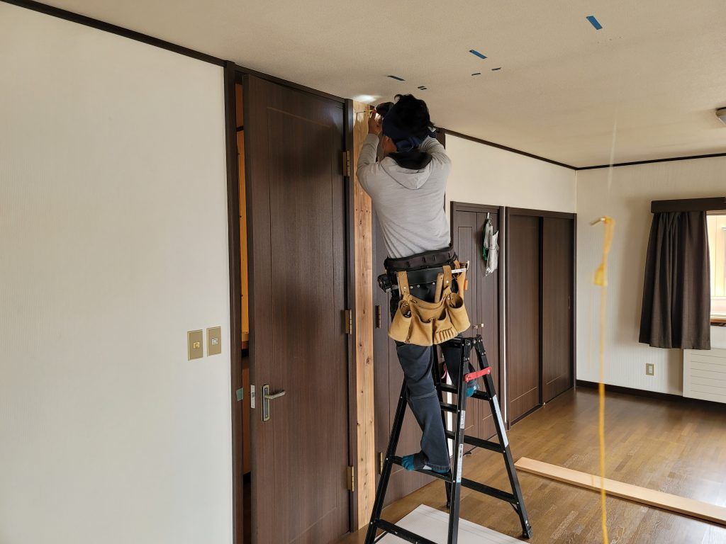大工さんに可動間仕切を取付けるために木枠(下地兼建具サイズの調整のため)を取付け中