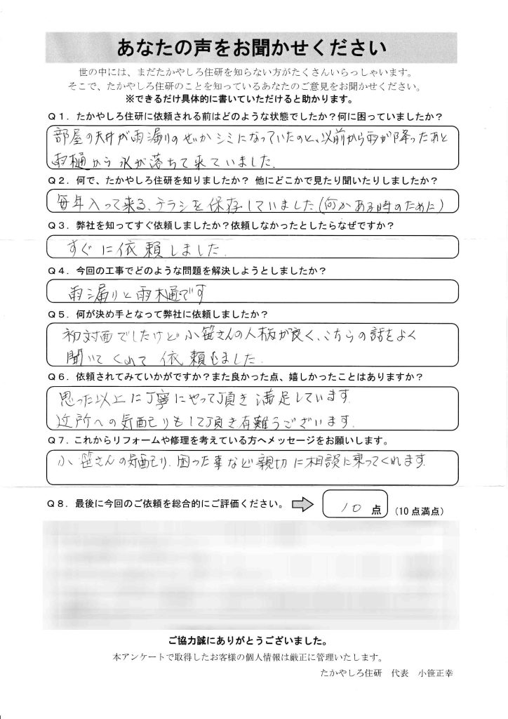 部屋の天井が雨漏りのせいかシミになっていたのと、以前から雨が降ったあと雨樋から水が落ちて来ていました。