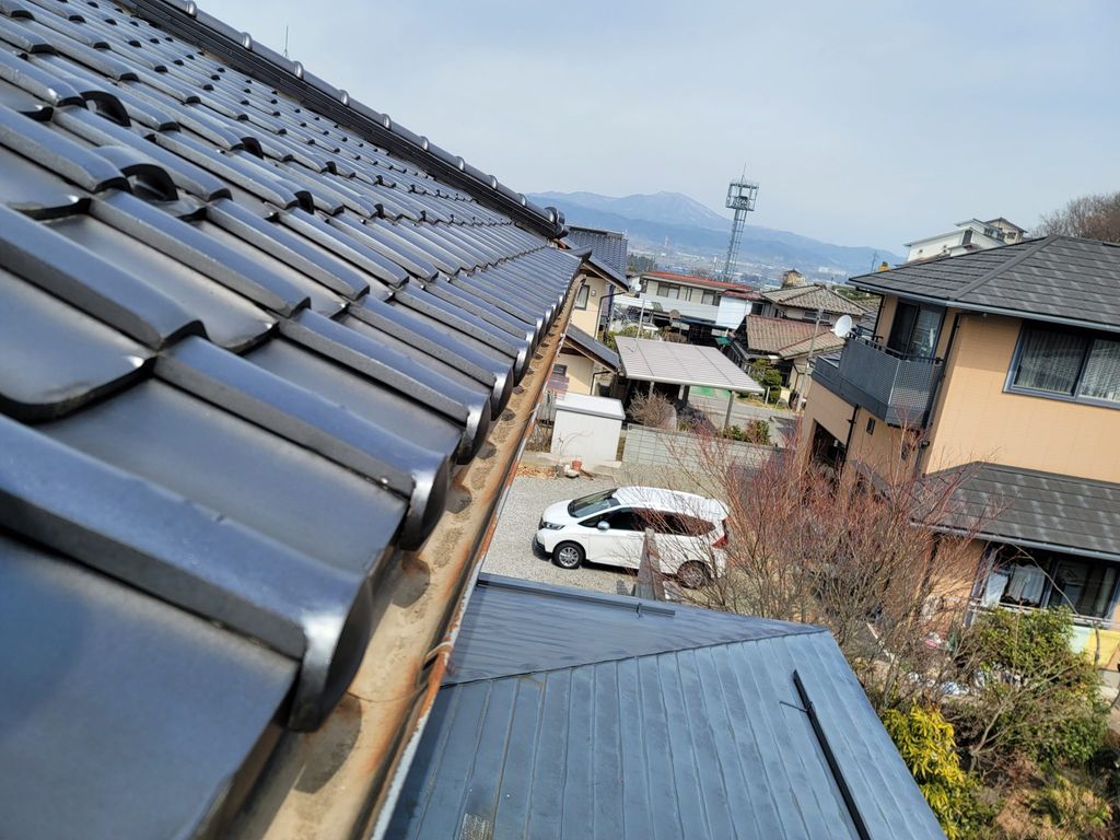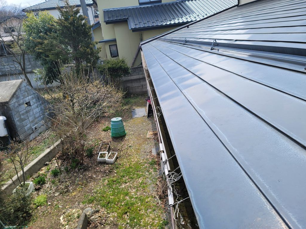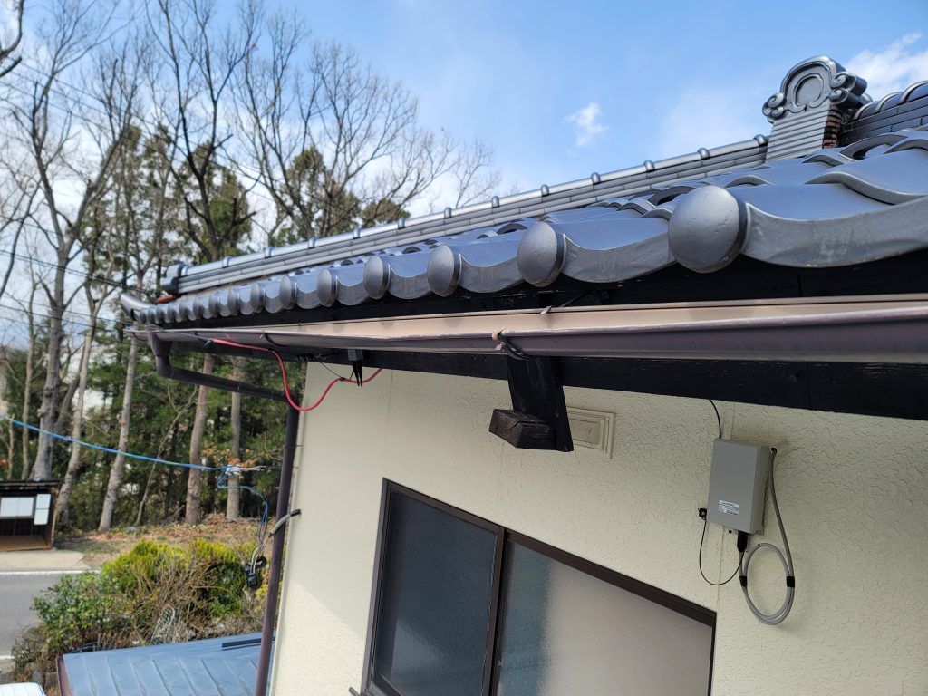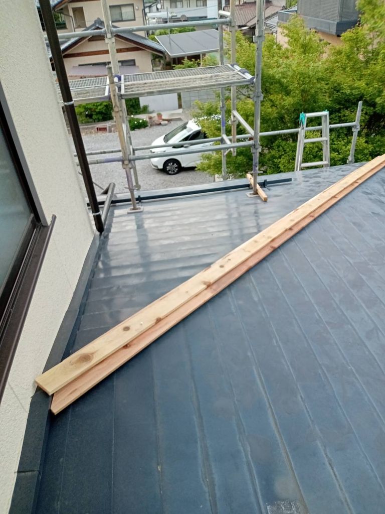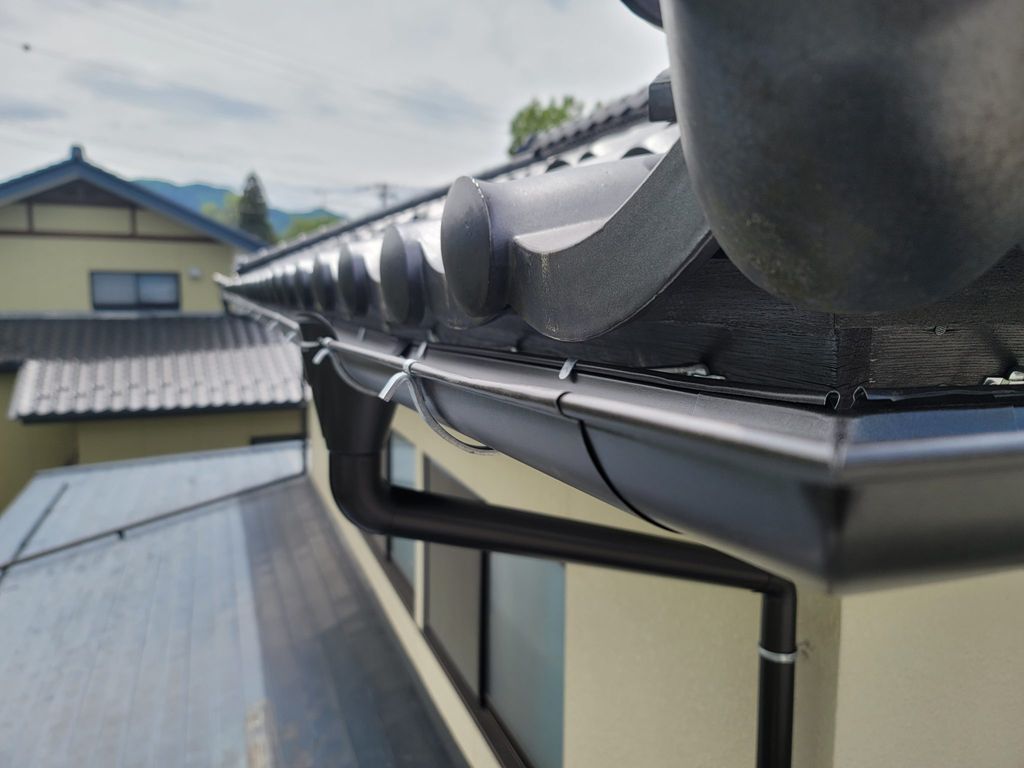 現地調査を行ったところ、雨漏り箇所の丁度上あたりで雨樋から雨水が落ちていたことがわかりました。雨樋を取替えれば雨漏りはしないと思っていましたが、お客様からの要望で雨樋取替えと一緒に可能性のある下り棟に笠木(棟カバー)を取付けることにしました。また、雨樋が雪の影響で壊れている箇所も複数見つかり火災保険を利用することを提案。