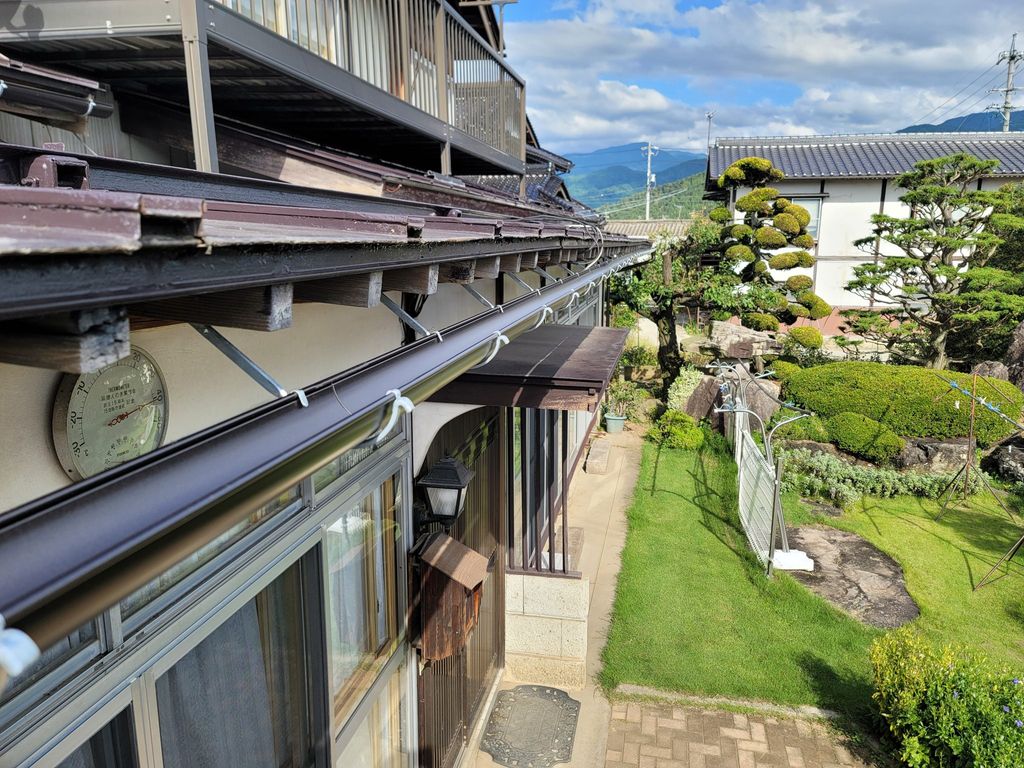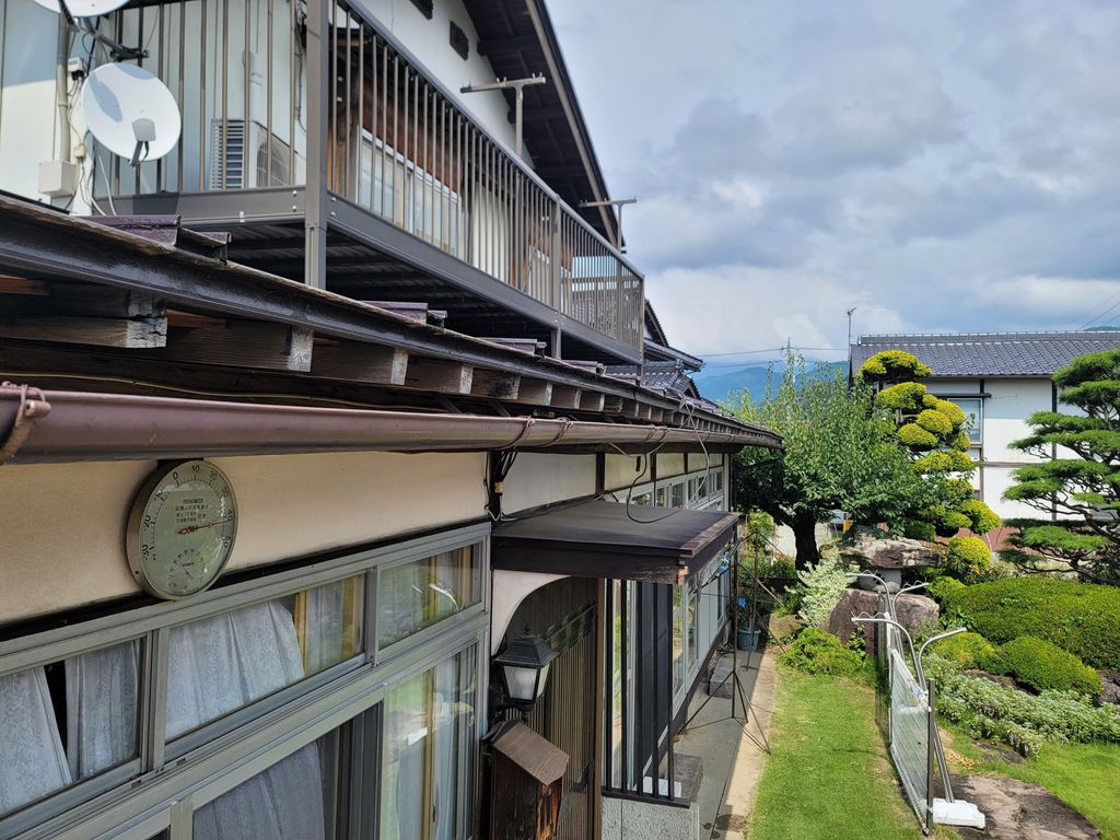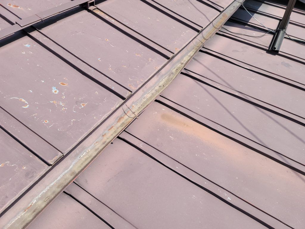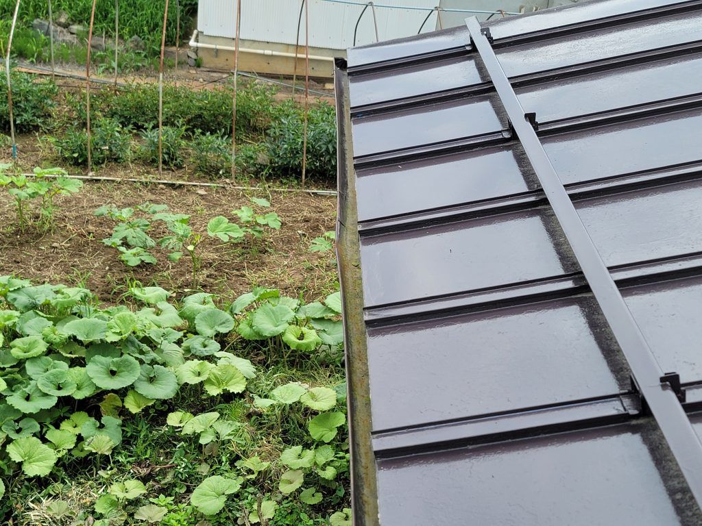 雪の影響で雨樋が垂れてしまい同じ箇所から雨水が落ちてしまい下のトタン屋根がサビ始めてきている