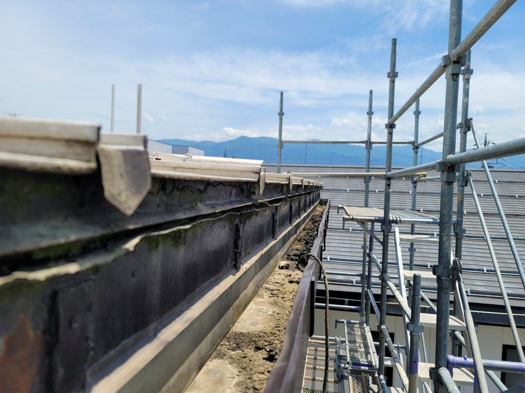 唐草の内側に差し込んで、雨樋の内側に雨水が入り込まないようにするスチール製の板です。