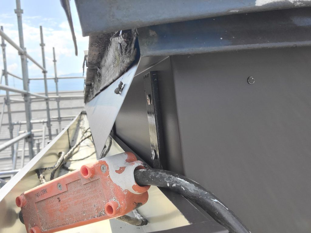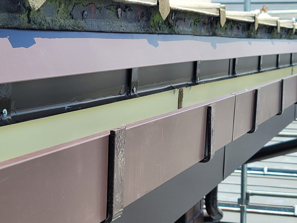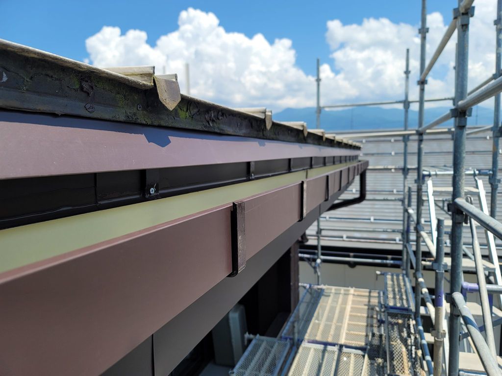 最後に雨樋を新しくして、もう一つは今回新しいものを取付けました。それが雨水誘導板です。雨水を確実に雨樋に落とすためのものです。