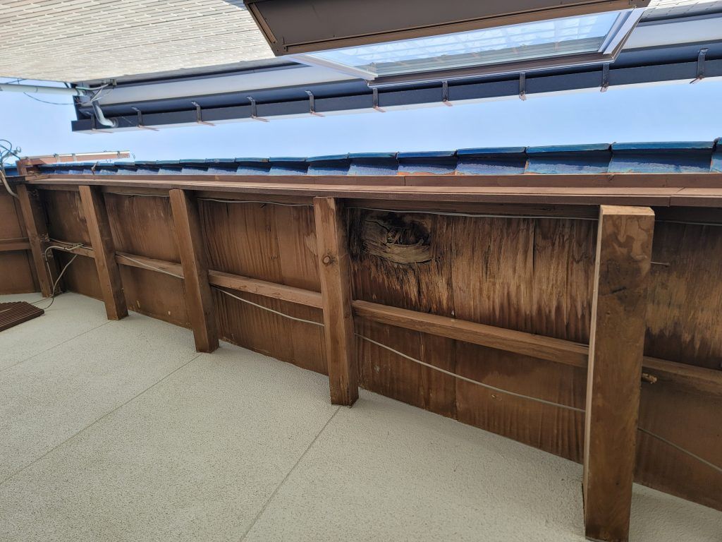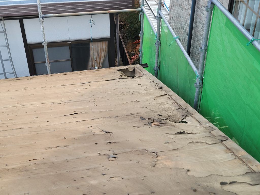 既存瓦を撤去して、これから軒先の合板を取替えていきます。