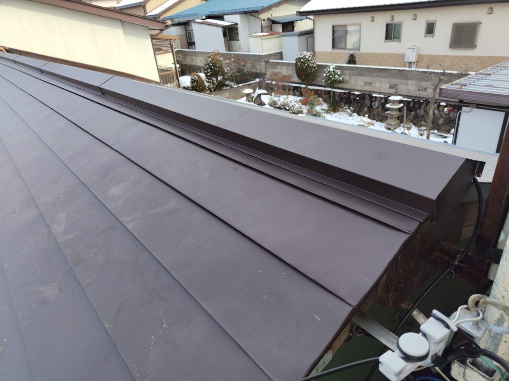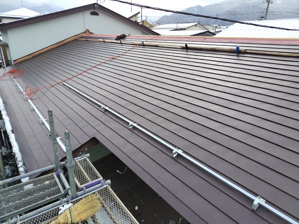 その上にトタンを葺いていきます。もちろん、雪止めアングルもその都度取付けします。