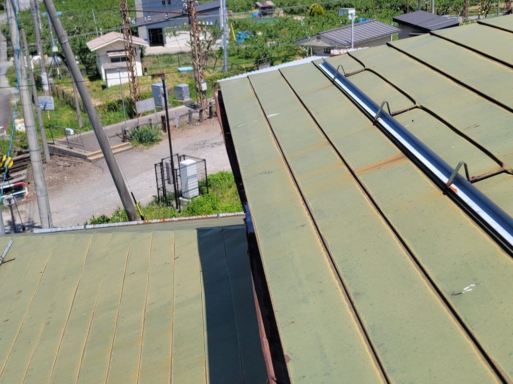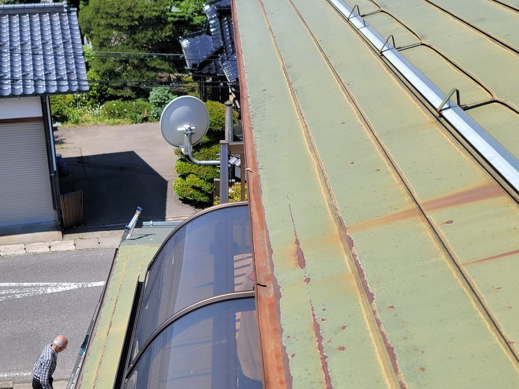 写真中央になる雨樋内部のサビが広くなっている箇所は、雨樋が垂れて、雨水が溜まってしまう箇所になります。