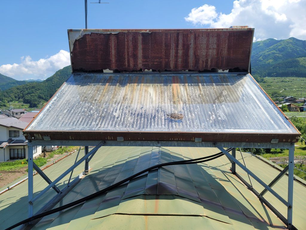 以前からもう使用はしていなかったようですが、長期間放置していたためかサビてボロボロで穴が開いている部分から内部に鳥が入り巣になっていました。