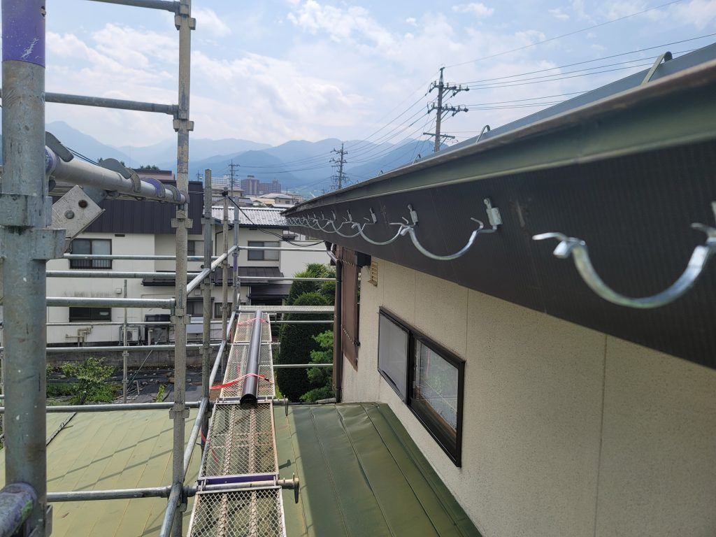 既存雨樋を撤去してから、水勾配を確認して、受け金物の位置を張り振り、受け金物を取付けました。