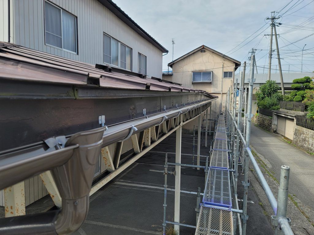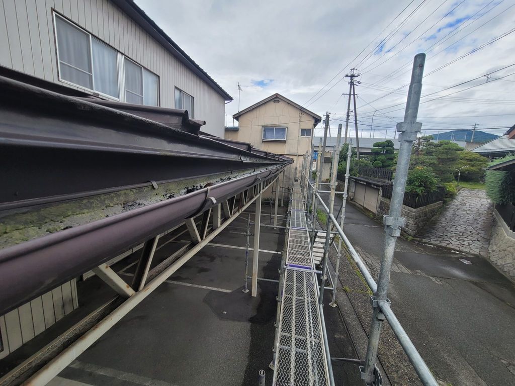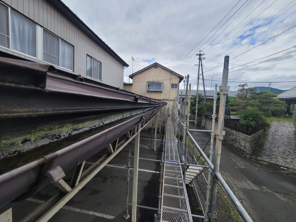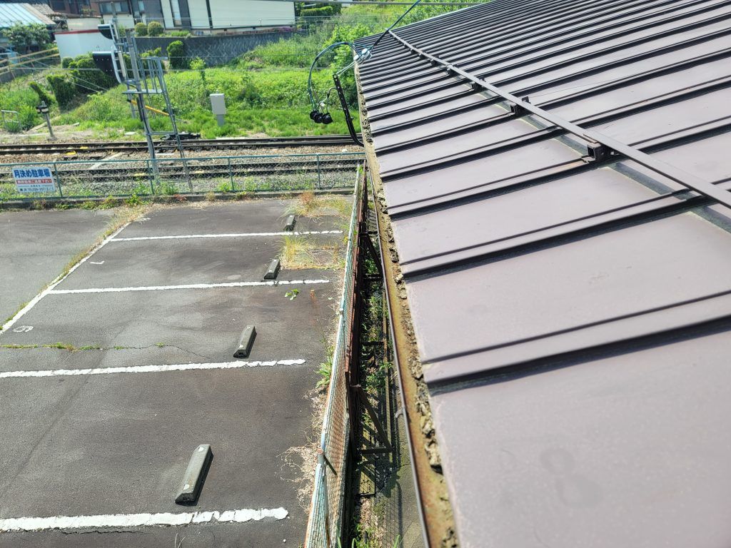 屋根が波を打っていて、雨樋の水勾配が上手くとれていない為、雨水は蒸発するまで溜まっている状態。