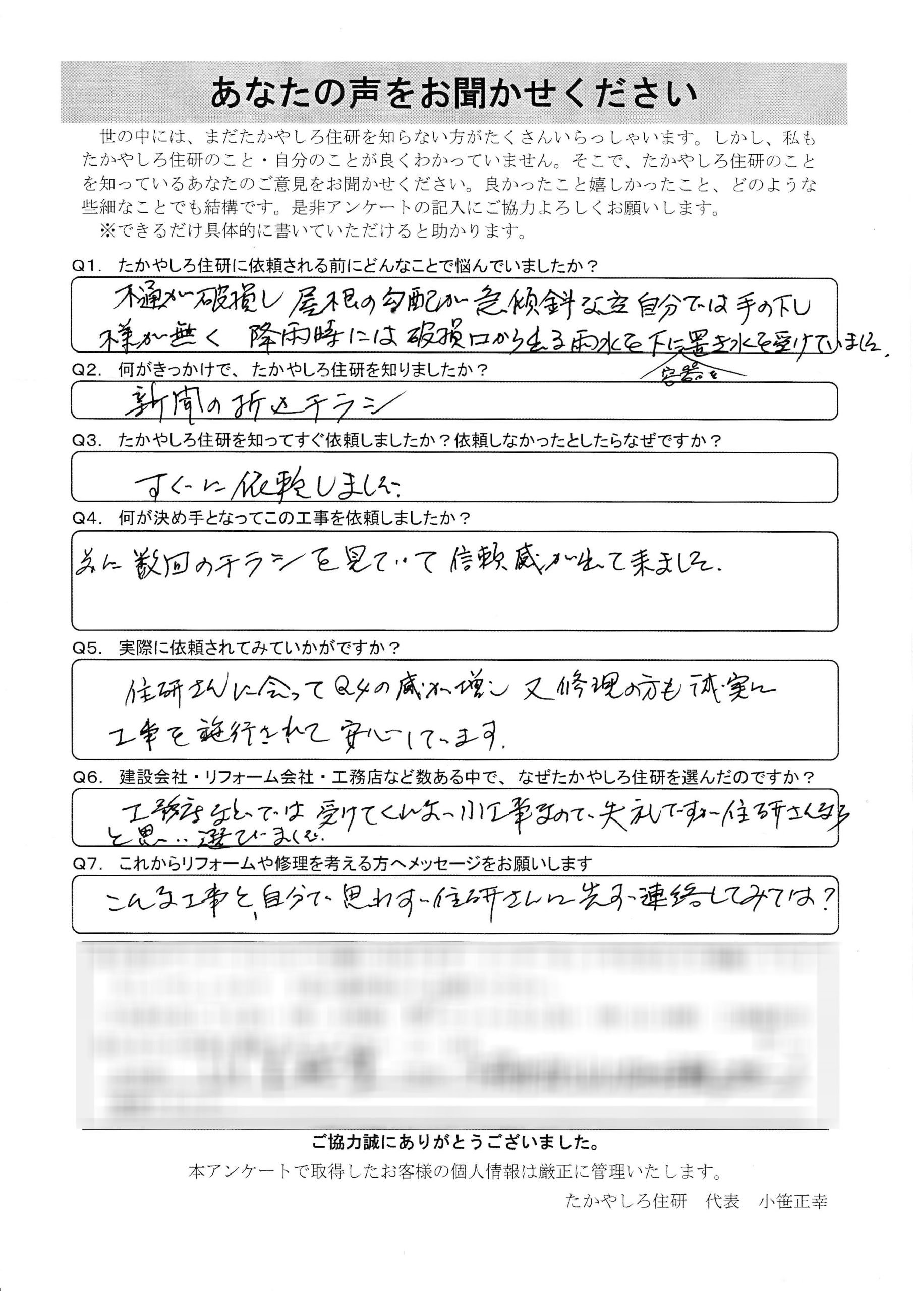 - 住研さんに会って信頼感が増し、また修理の方も 誠実に工事を施工されて安心しています。