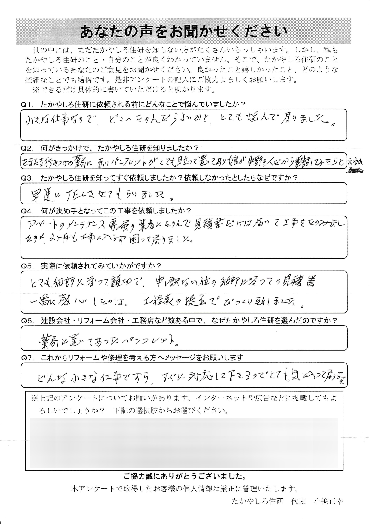 - どんな小さな工事ですら、すぐに対応して下さるので とても気に入っております。