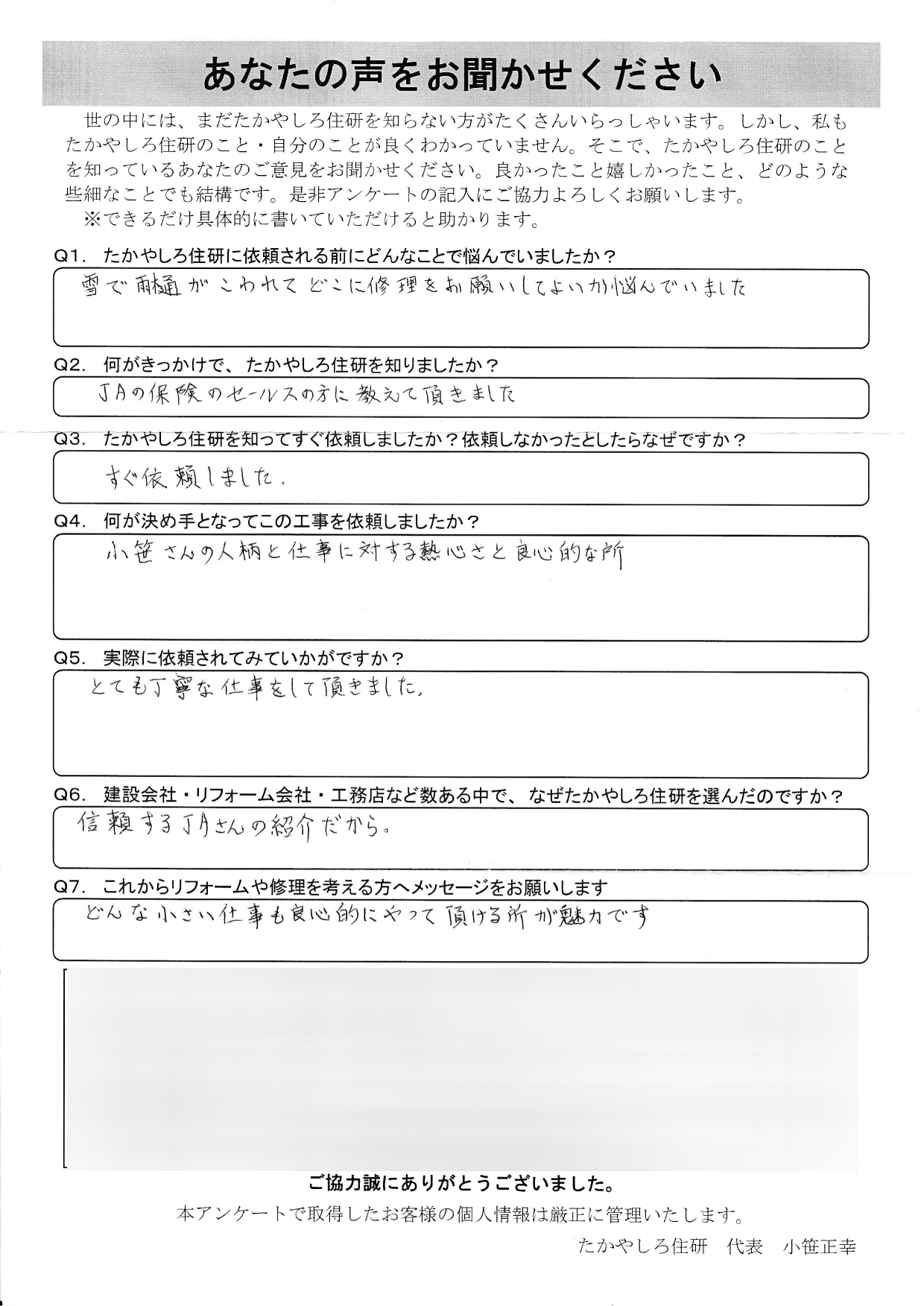 - 雪で雨樋がこわれてどこに修理をお願いしてよいか悩んでいました。