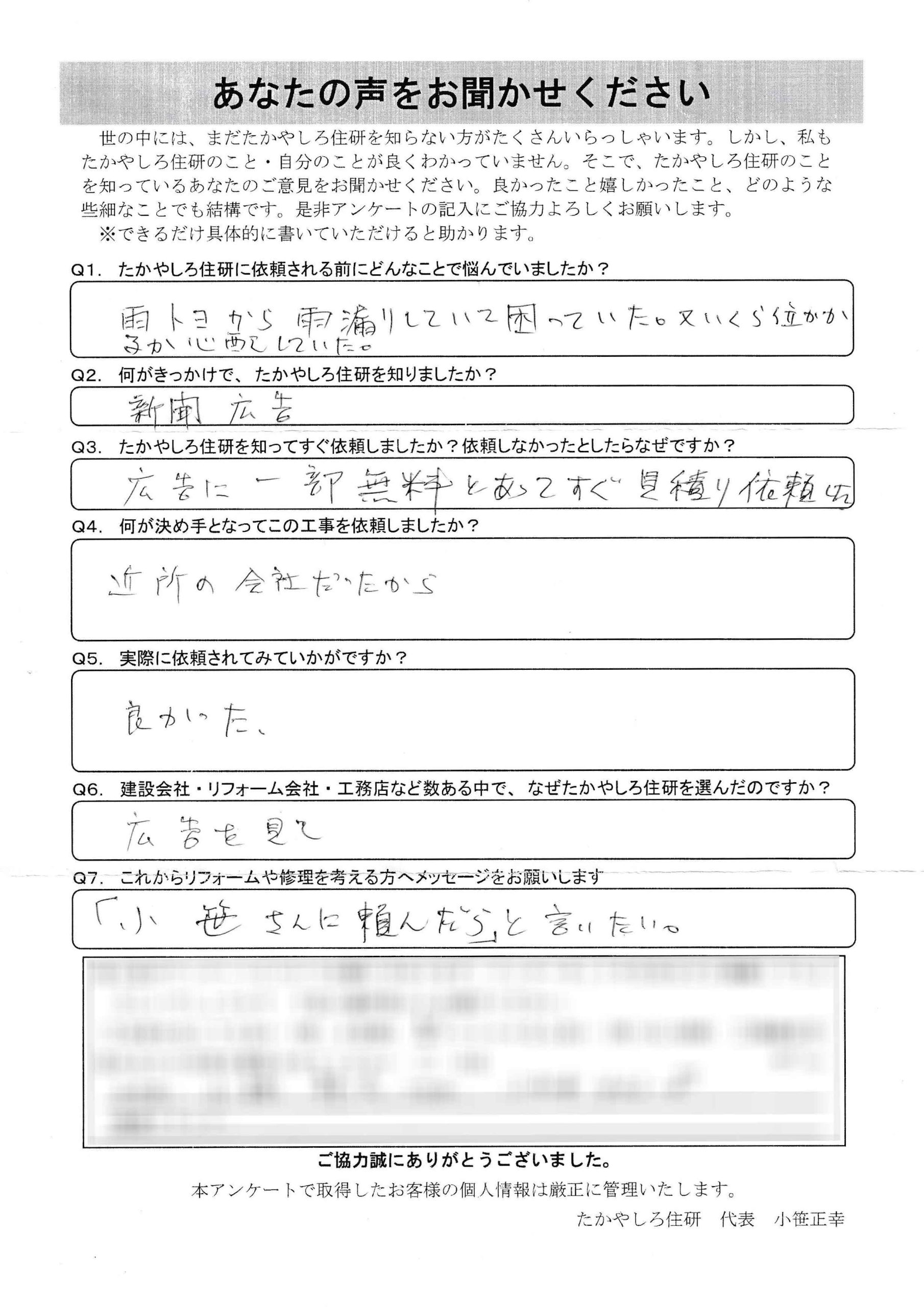 - 雨トヨから雨漏りしていて困っていた。又いくら位かかるか心配していた。