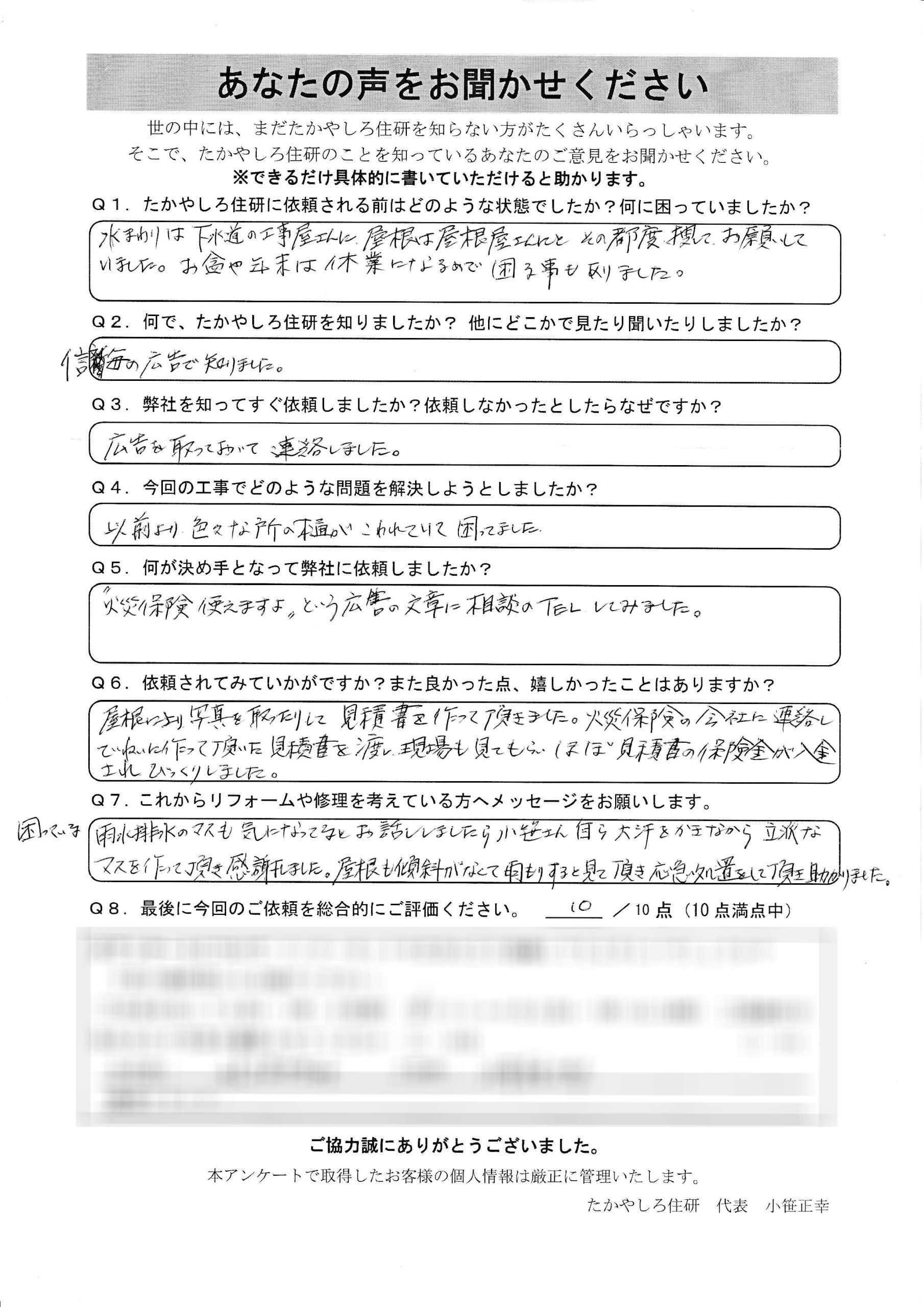 - 困っている雨水排水のマスも気になってるとお話ししましたら、 小笹さんが自ら大汗をかきながら立派なマスを作って頂き感謝 しました。屋根も傾斜がなくて雨もりすると見て頂き応急処置を して 頂き助かりました。