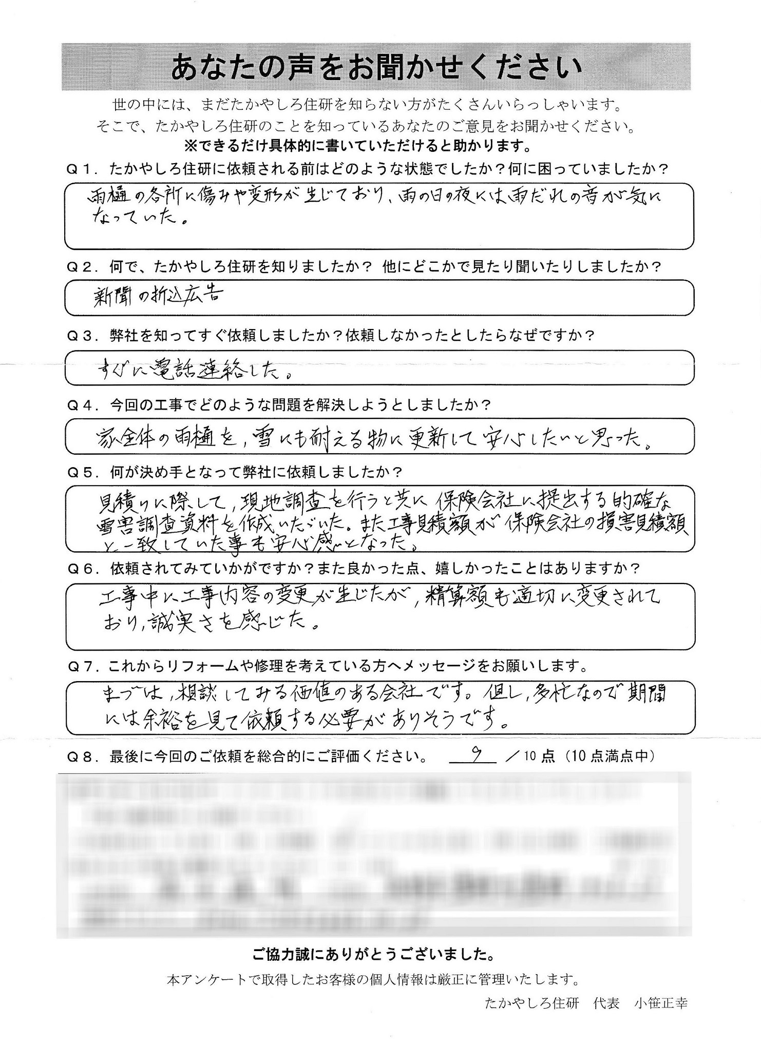 - 見積りに際して、現地調査を行うと共に保険会社に提出する的確な 雪害調査資料を作成いただいた。また工事見積額が保険会社の損害 見積額と一致していた事も安心感となった。